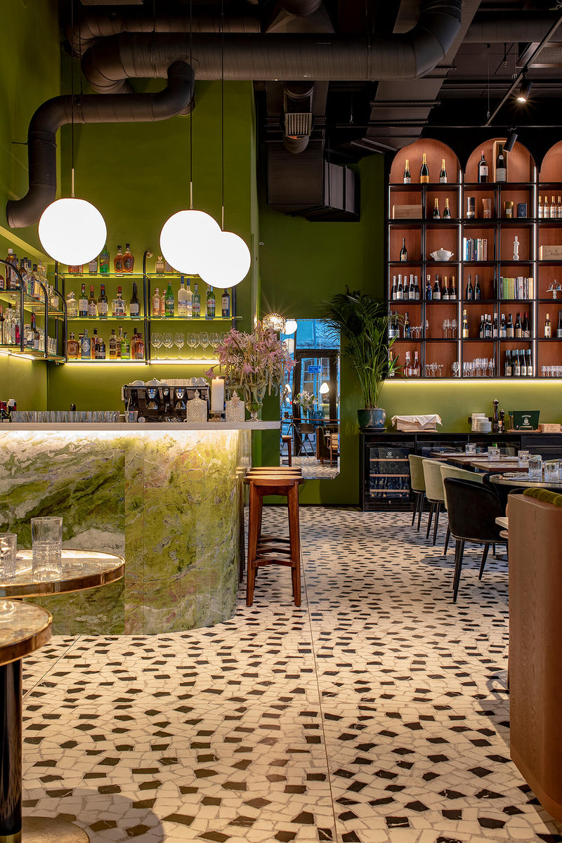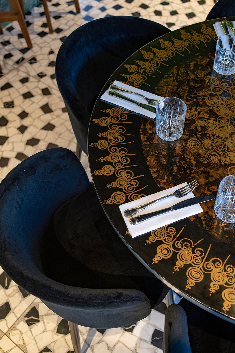 Marit's love for contrast creates a beautiful dialogue between different materials and surfaces - matte green walls, shiny ceramic tiles, funky patterned floor, antique brass, and classical Parisian details. All of the furniture is custom designed by Ilison, topped up with some exceptional antique and vintage finds.